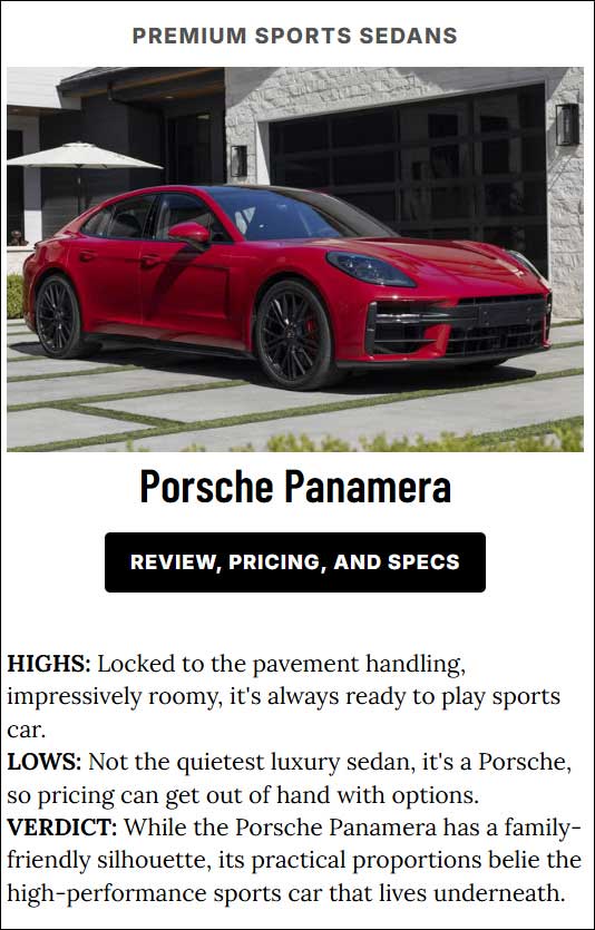 長所: スポーツカーを彷彿とさせるハンドリング。非常にパワフルなターボV8エンジン。広々とした室内空間と十分な荷室容量。