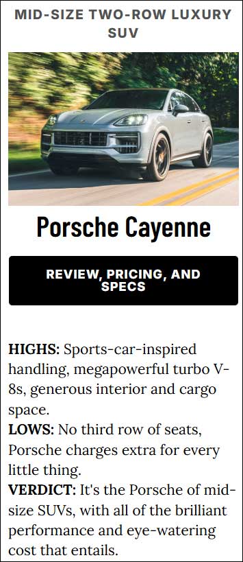 結論: カイエンはミッドサイズSUVにおけるポルシェそのものであり、卓越したパフォーマンスと目を見張るほどのコストを併せ持つ一台である。
