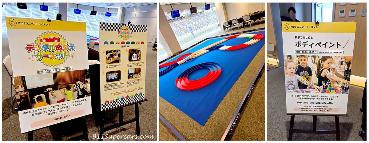 キッズ用のエリアも充実していて、ボディペイント、デジタルぬりえサーキット、ミニ四駆サーキット、そしてスーパーカーめんこなどがありました。