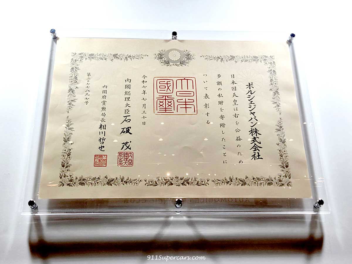これはポルシェジャパンが紺綬褒章を授与された時の賞状だそうで、その中央には国璽(こくじ)と呼ばれる立派な印も。