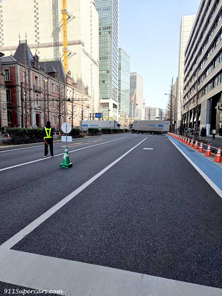 During the Tokyo Marathon, traffic restrictions are put in place around the marathon route and many roads are temporarily closed. When these roads are closed, police vehicles and other vehicles are parked diagonally blocking the road.