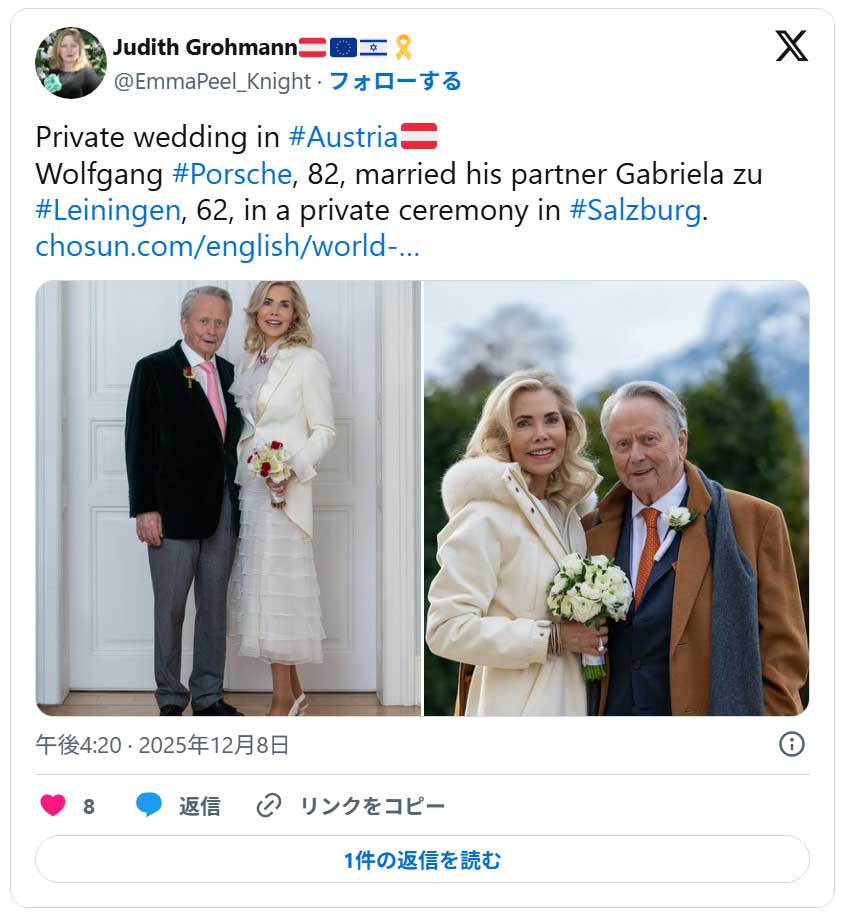 ポルシェ氏は現在82歳、そして奥様となられた方は20歳年下の62歳。長年の恋人であったGabriele zu Leiningenさんという方とのことです。