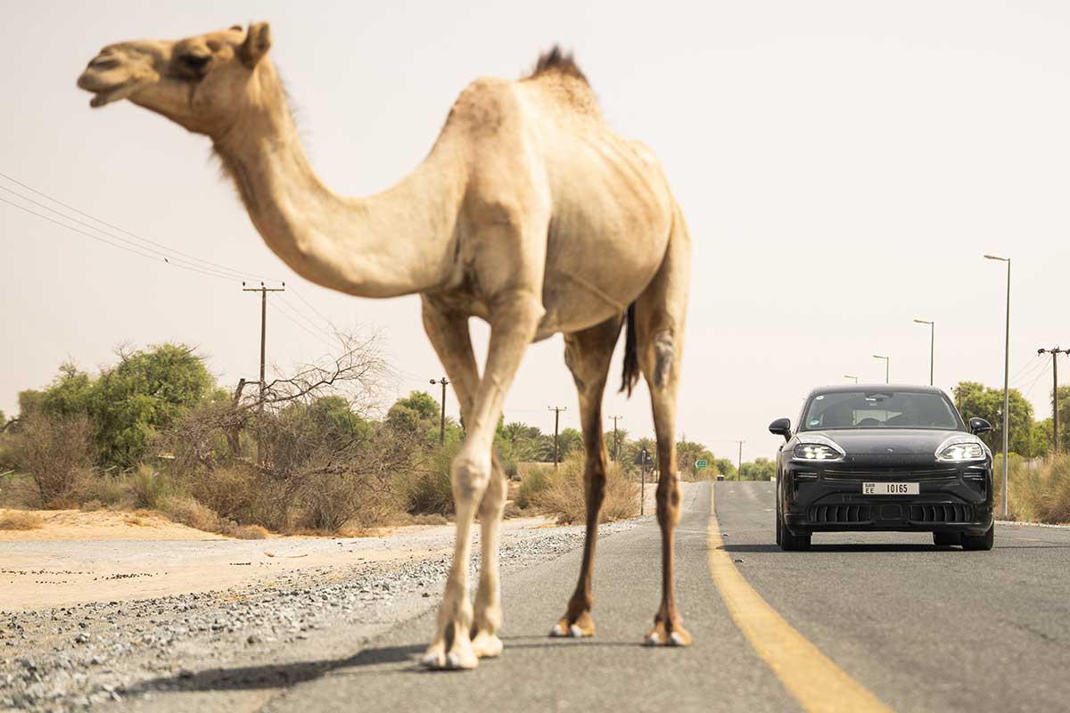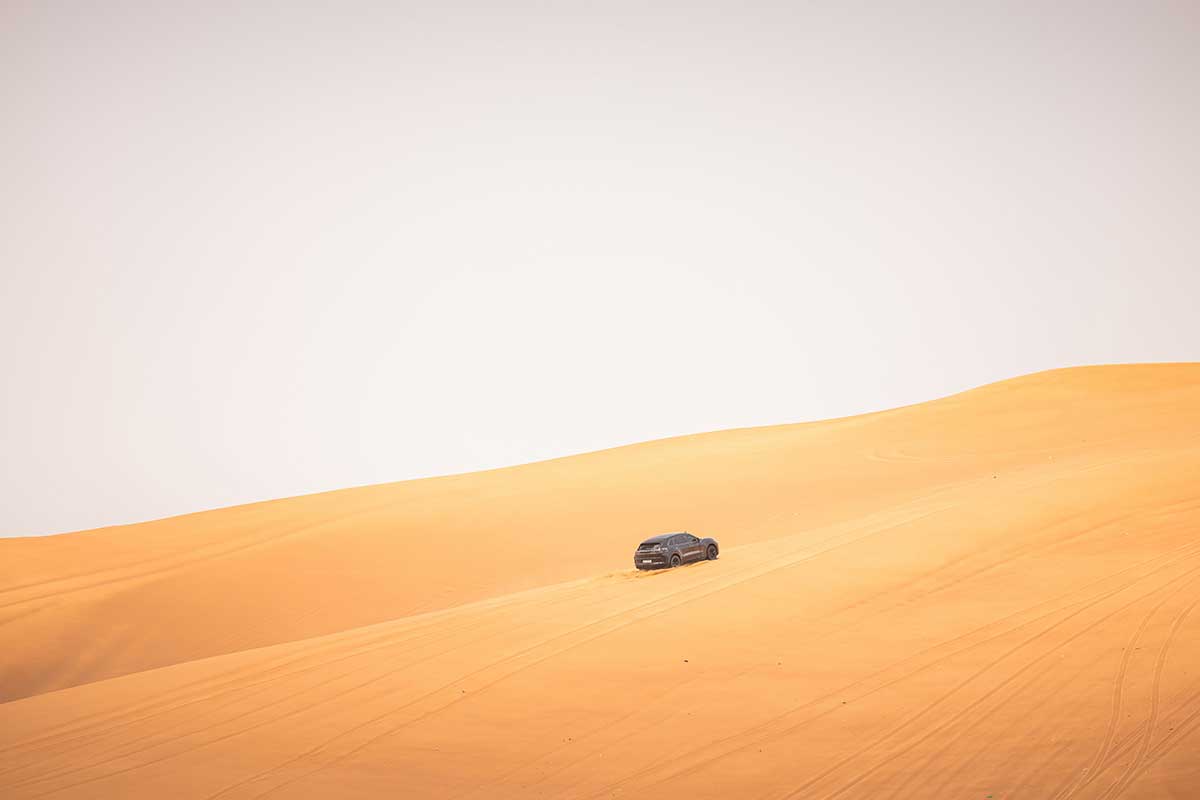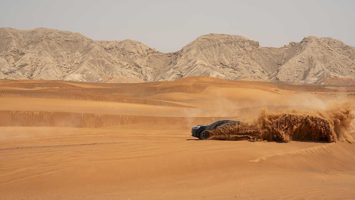 ドバイという、都市と砂漠という対極的環境がある場所でポルシェのフル電気自動車SUVを初披露するという演出で、細かいパウダー状の砂丘、25度を超える勾配、さらには気温も40℃越えという過酷なアラビア砂漠環境での走行なども紹介されていました。