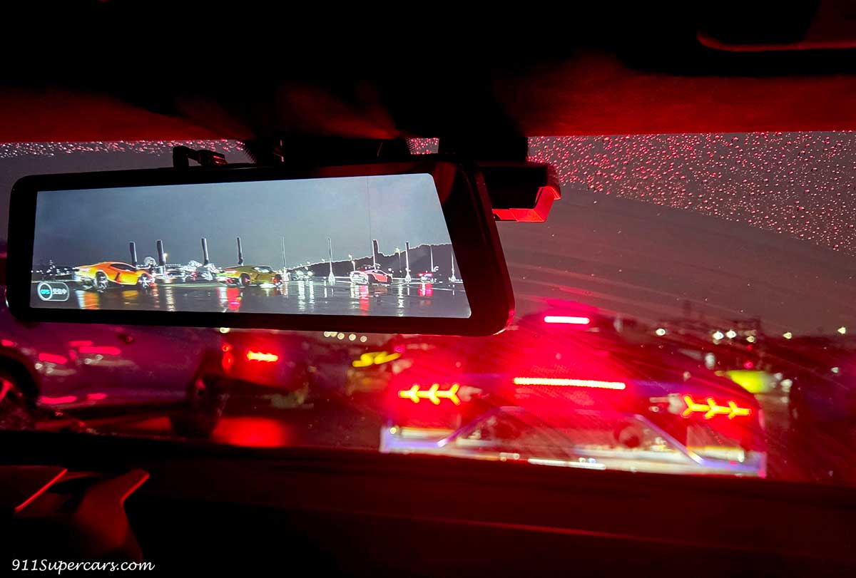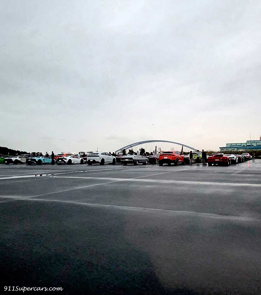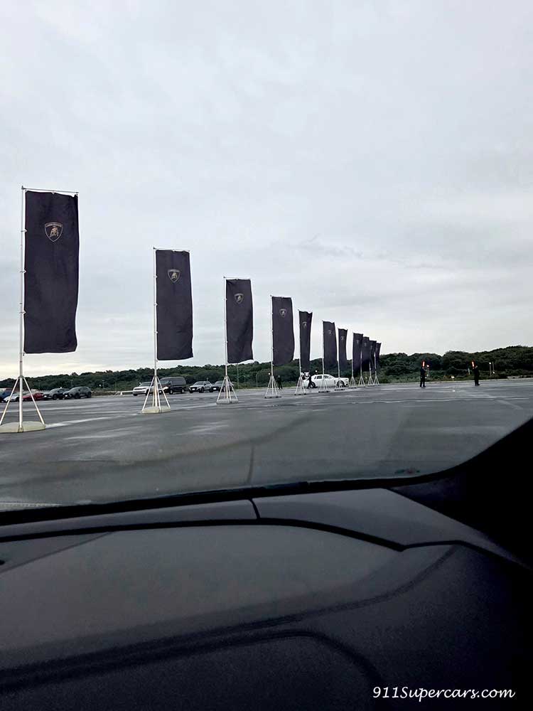 車に乗り込み指示された通りパレードランへ向けて走り出すわけですが、車内から見える景色には目の前にも、バックミラーに写る光景にも当たり前ですがランボルギーニたちがずらり。