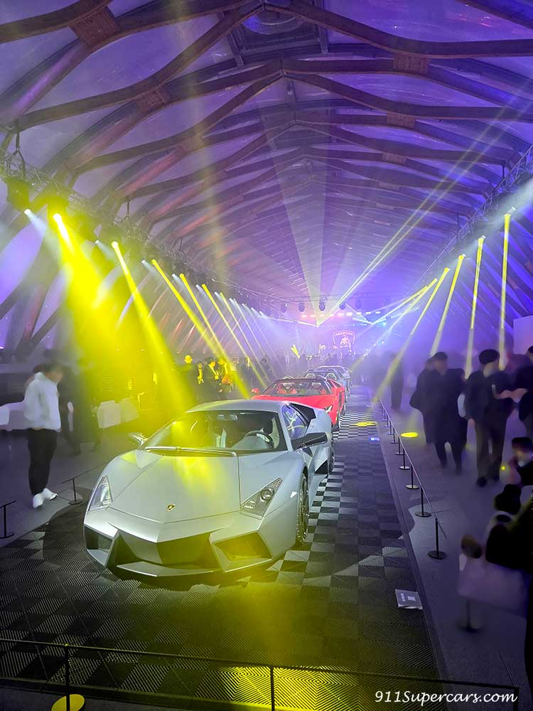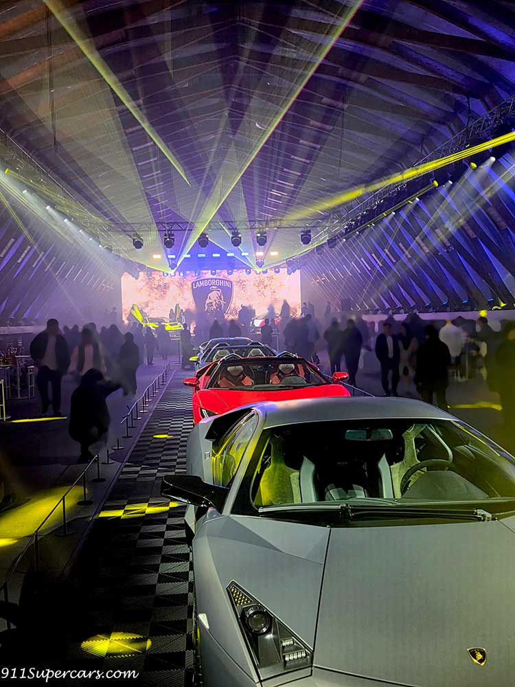 屋内会場の中央には正面奥の舞台に向けて4台のランボルギーニが鎮座。