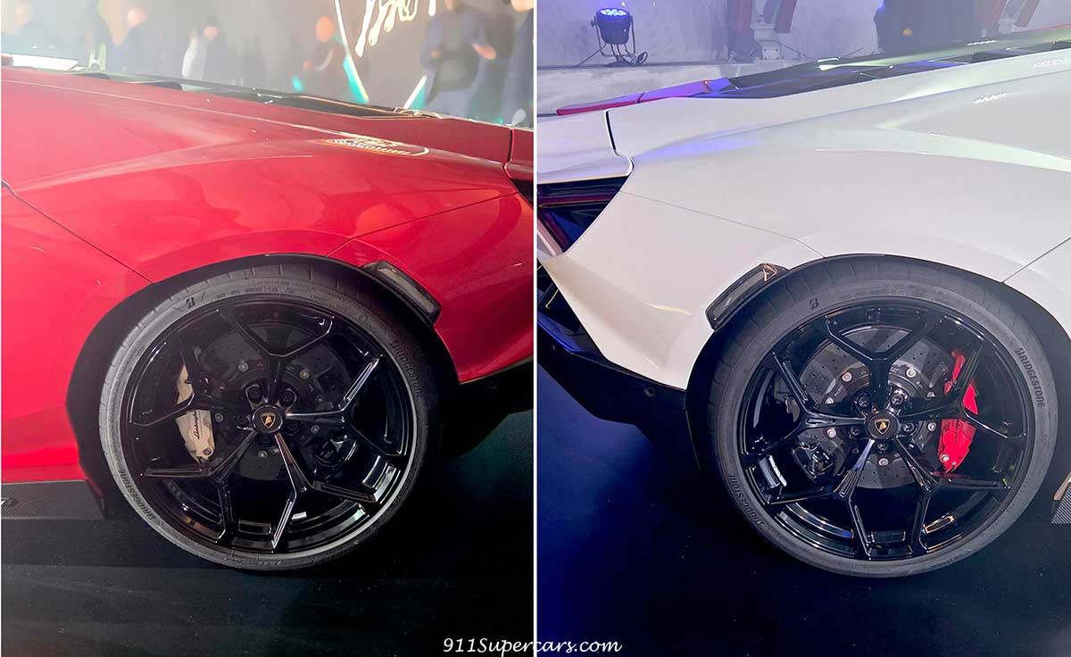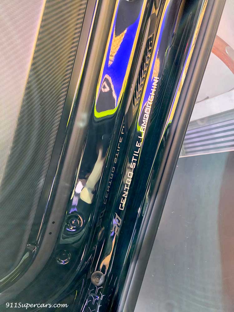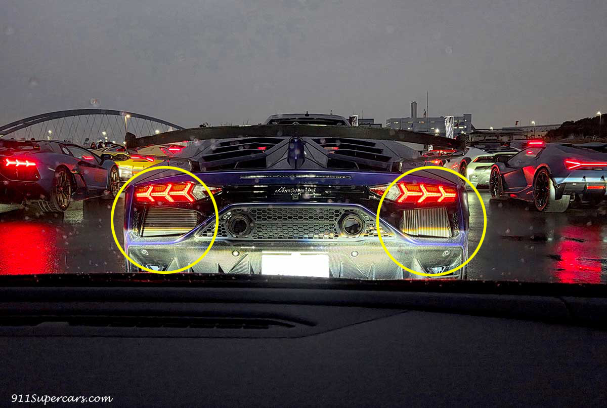 出発直前に我が家のウラカンEVOの前に止まっていたこちらのお車ですが↓アヴェンタドールSVJ?(違っていたらすみません)、良く見ると黄色で丸したところが左右で縦と横になっていて違いません??