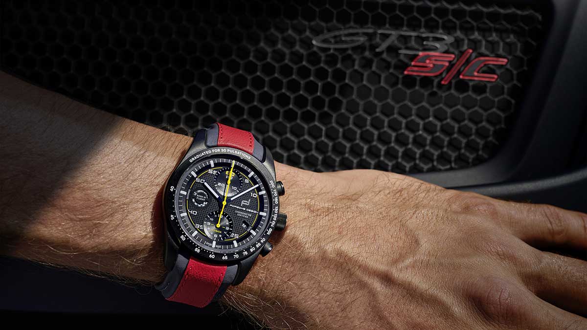 - 「クロノグラフ 911 GT3 S/C」は高精度なCOSC認定のポルシェデザイン製キャリバーWERK 01.200を搭載、フライバック機能も備える