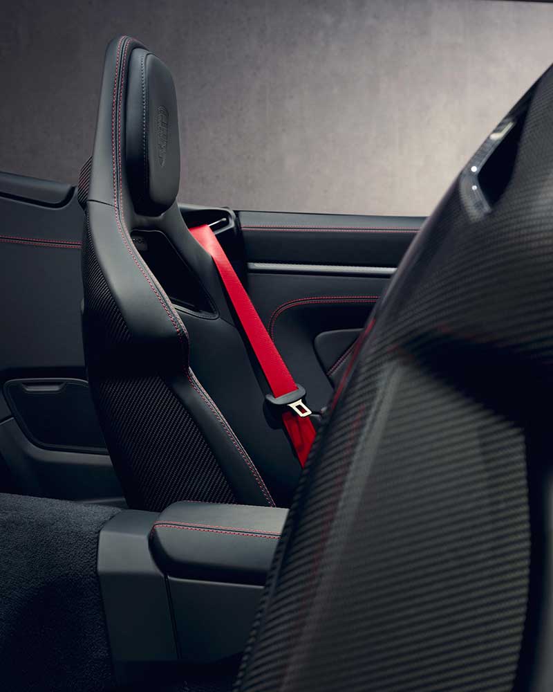 - インテリアには軽量カーペットやカーボンファイバー製プルハンドル付きの軽量ドアパネルを採用、これらも911 S/Tから受け継がれたデザイン要素