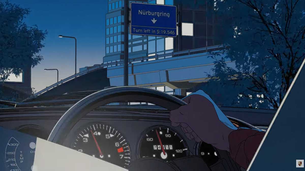 さらに良く見てみると走っている風景にうつる高速道路の案内には「Nürburgring (ニュルブルクリンク)」の文字があり、その下にはそこまでの距離の案内として「5:19.546」。