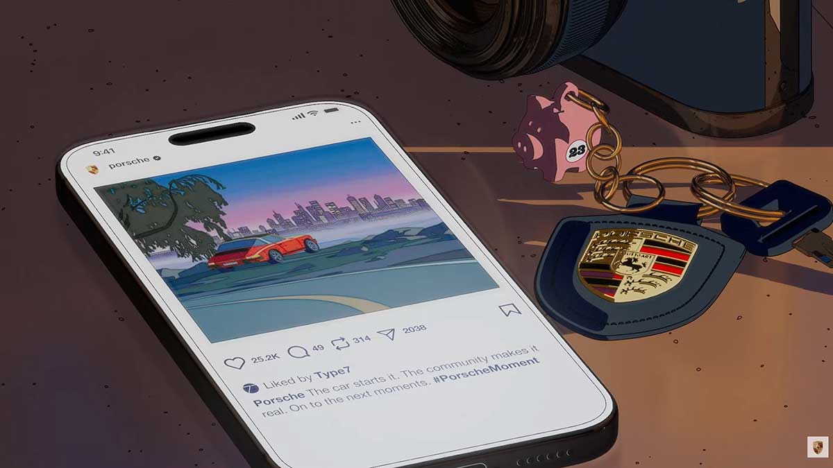 最後にはたぶん自宅に帰ってきてスマホをキーを置いた画面になり終わるわけですが、ここで表示されている画面がPorscheのインスタ投稿画面となっていて、それにType7が「いいね」をつけていたりします。