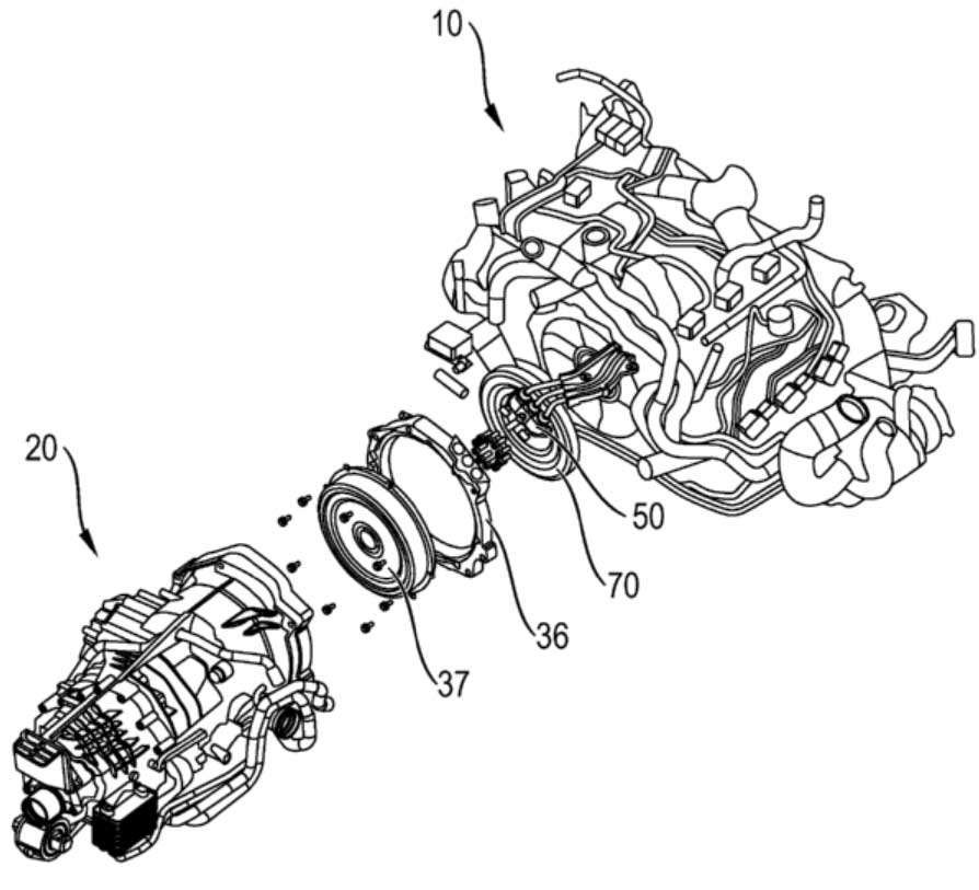 特許申請された今回の内容は、簡単にいうと『エンジンとトランスミッションの間に薄型のモーターを組み込み、ハイブリッド化しても駆動系の長さを延ばさずに高トルク密度と優れた冷却性能を両立出来る構造』というもの。