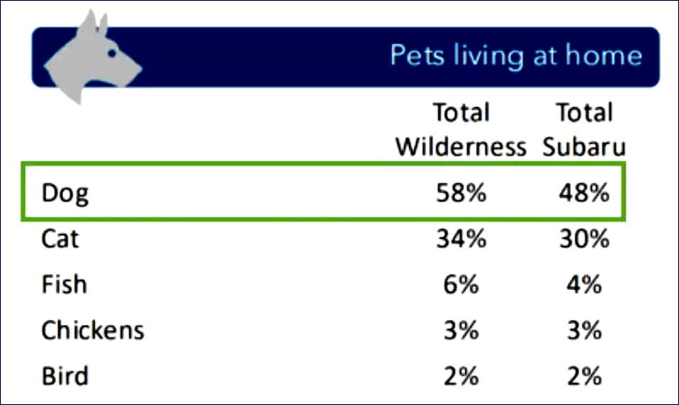 この結果を見るとWildernessを購入された方の方が通常のスバル車所有のデータよりも犬を飼っているパーセンテージが10%増加しています。